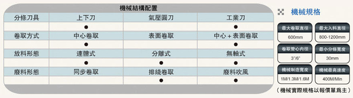 成品卷取方式:滑差式卷取軸,適用更多材料,換軸方式經(jīng)特殊設(shè)計(jì),可以隨時(shí)更換。