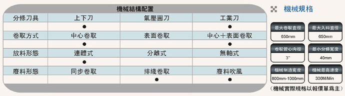 成品卷取方式:可配備板條式氣壓軸及滑差式卷取軸,適用更廣范圍,換軸方式經(jīng)特殊設(shè)計,可以隨時更換。