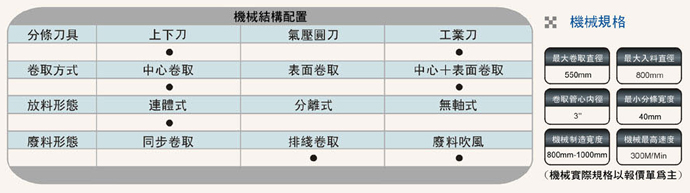 成品卷取方式:可配備板條式氣壓軸及滑差式卷取軸,適用更廣范圍,換軸方式經(jīng)特殊設(shè)計,可以隨時更換。